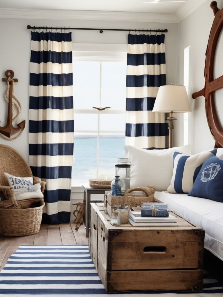 Chic Vintage Sailor: Transform your space into a nostalgic maritime retreat with this home decorating idea. Embrace vintage-inspired nautical elements such as intricate ship models, aged wooden crates, and weathered sailor hats for an authentic touch. Create a cozy ambiance with soft linen curtains, striped rugs, and seashell accents, making every day feel like a coastal getaway.