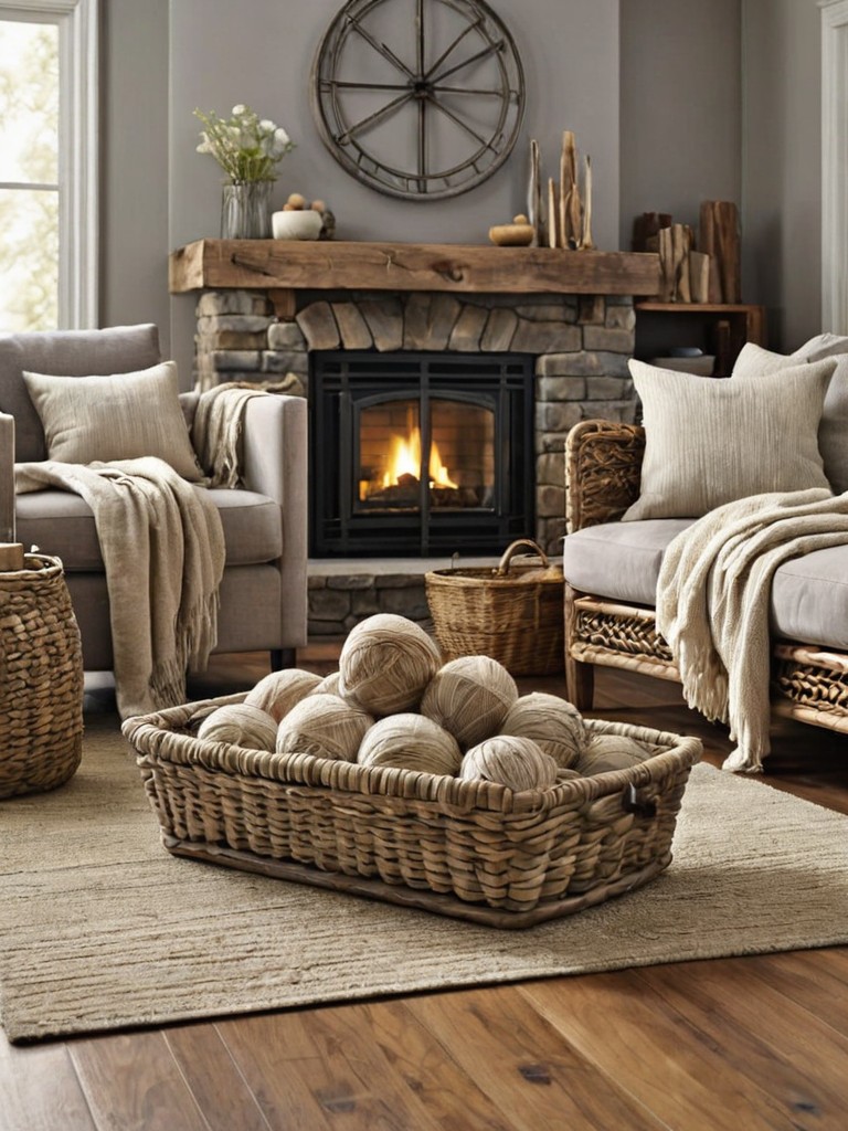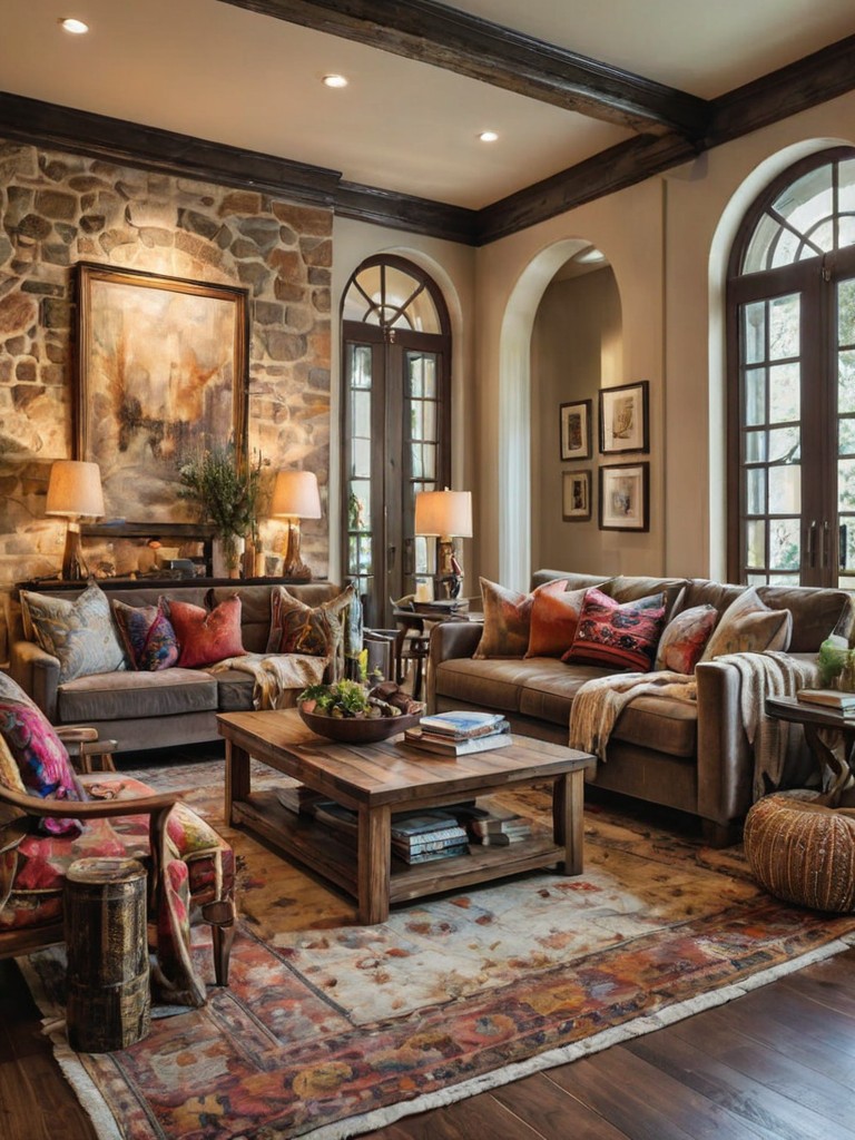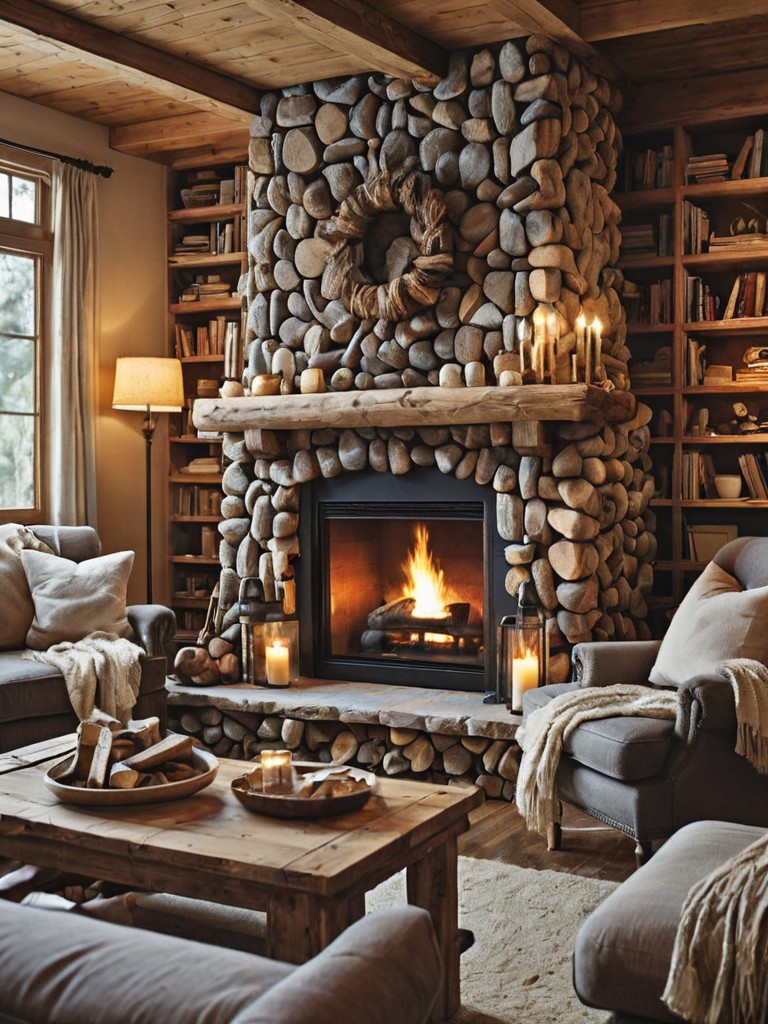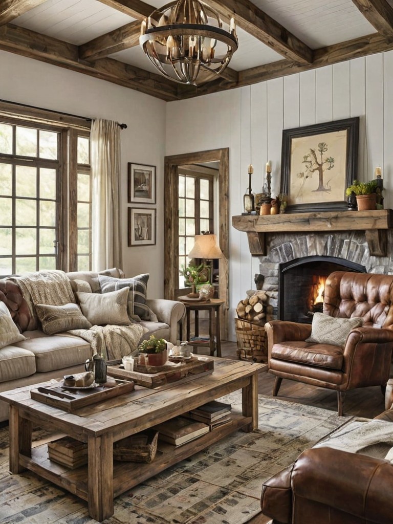 Rustic Retreat: Imagine transforming your living space into a cozy haven with a rustic theme. Picture a wooden paneled accent wall adorned with vintage signs and mounted antlers, perfectly complementing a plush leather couch. Complete the look with warm earth-toned throw pillows and a charming personalized sign hanging above the fireplace, inviting you to unwind in your own rustic retreat.