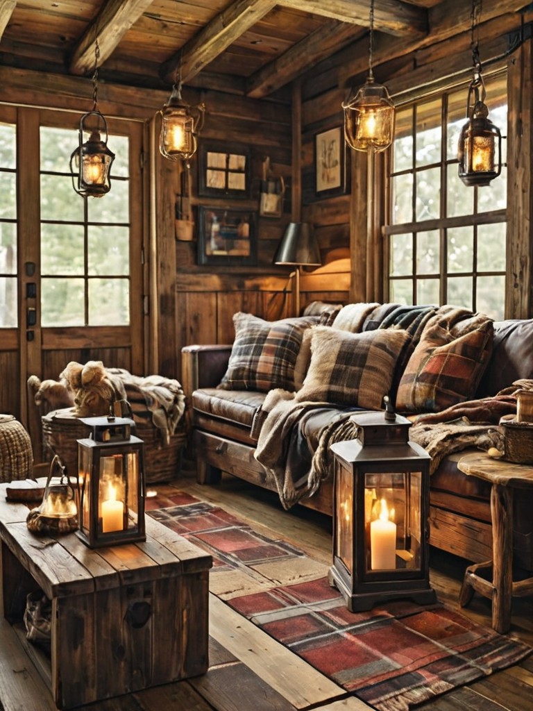 Wooden panel accent wall, Vintage signs, Mounted antlers, Plush leather couch, Earth-toned throw pillowsDescription