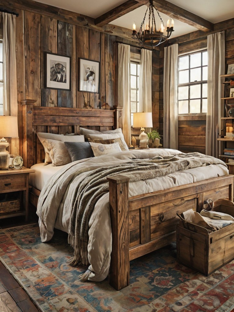 Reclaimed wood bed frame, Soft, neutral bedding, Muted tone pillows, Antique-inspired lighting fixtures, Vintage wall decorDescription