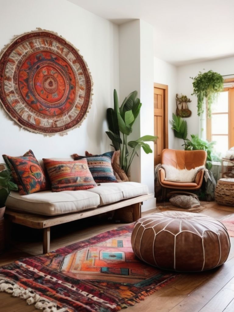 Colorful Bohemian Living Room: Create a vibrant and eclectic living space by combining bold patterns, rich textures, and a mix of vibrant hues in your home. Hang a statement tapestry on one wall to serve as a focal point, and complement it with an assortment of mismatched throw pillows on the sofa. Complete the look with a vintage rug, floor cushions, and a variety of potted plants to bring life and energy to your bohemian oasis.