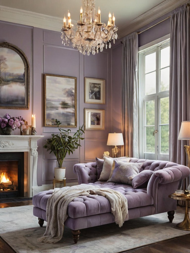 Pale lavender paint, Cool gray curtains, Warm earth tone decor, Velvet floor-to-ceiling curtains, Lavender-scented pillowsDescription