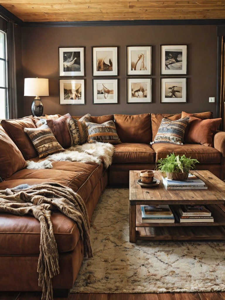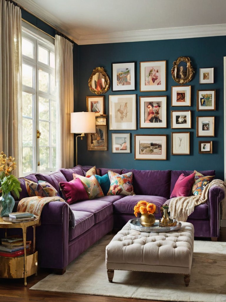 Plush velvet sectional sofa, Decorative throw pillows, Warm lighting, Vintage art and whimsical prints for a gallery wall, Cozy area rugDescription