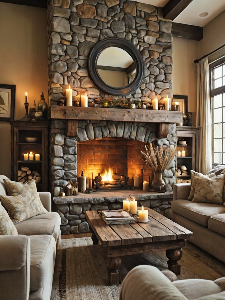 Hearth and Home: Create an inviting haven with cozy fireplace decor. Picture a rustic stone hearth adorned with flickering candles, framed by a mantle adorned with antiqued gold accents. Soft, plush throws and fluffy pillows beckon you to curl up by the fire, while a muted color palette and natural textures make the space feel warm and earthy.