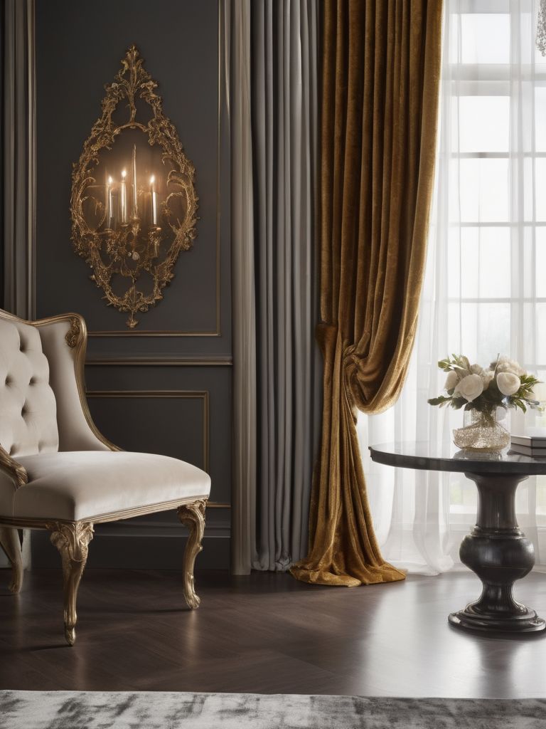 Indulge in the realm of exquisite aesthetics and unveil the perfect harmony of your living space with a captivating drapery design. Embrace the opulence of velvet curtains, cascading elegantly from floor to ceiling, evoking a sense of luxurious tranquility in your abode. Complement the serene ambiance with accents of gold and silver in the hardware, effortlessly transforming your home into a sanctuary of refined aesthetic bliss.