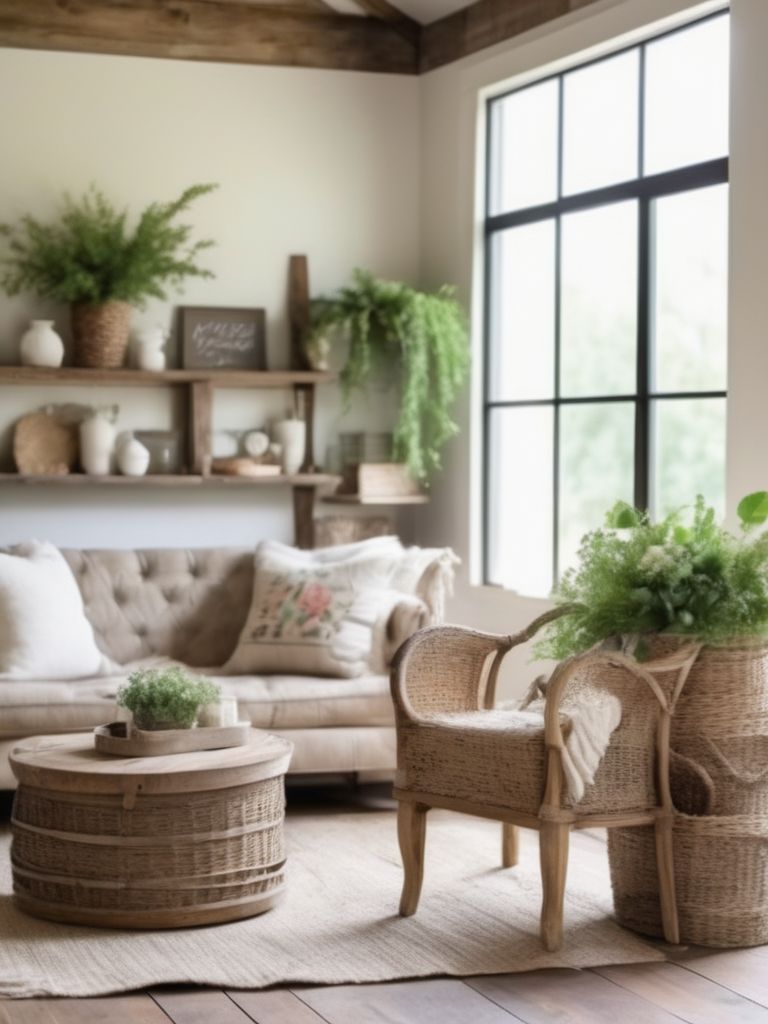 Reclaimed wood furniture, Stone decor accents, Earthy-toned throw pillows and blankets, Vintage-inspired wall art, Plush area rugsDescription