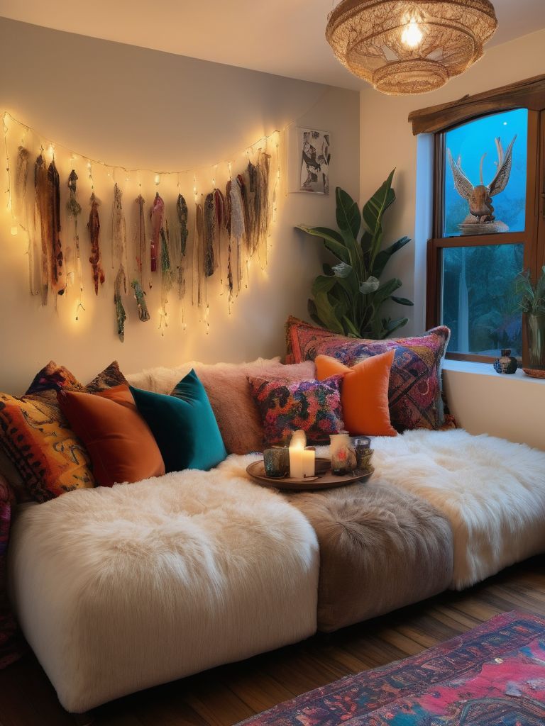 Moroccan-inspired rugs, Floor cushions, Macrame planters, Cascading greenery, Eclectic wall artDescription