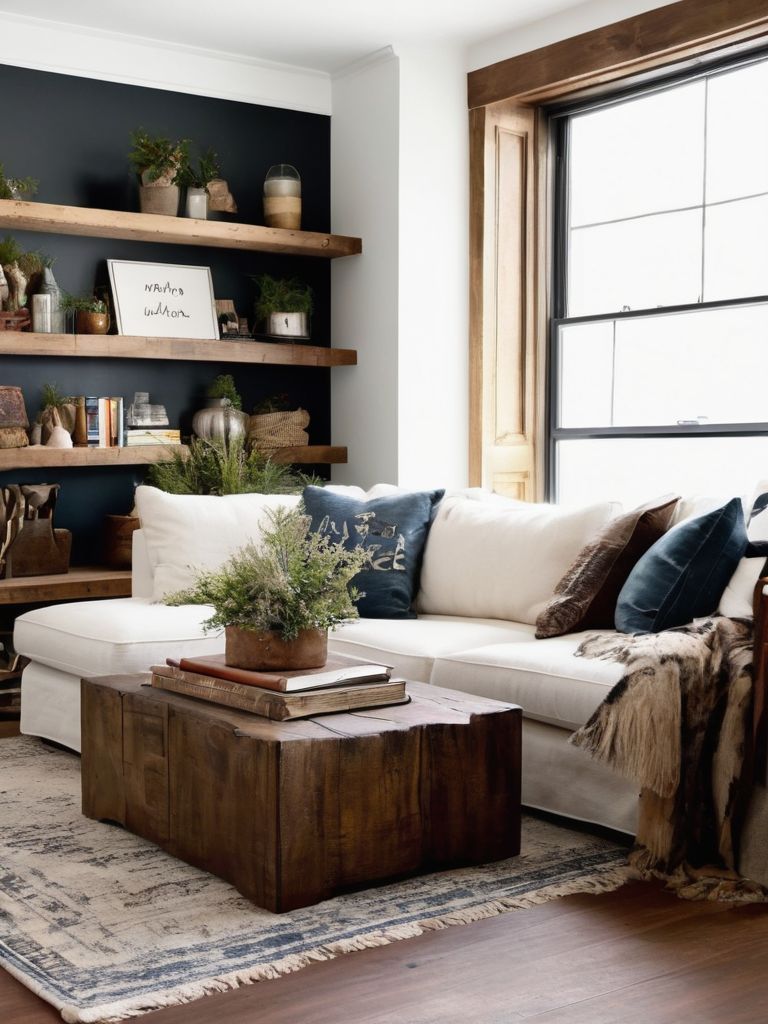 Furniture: Create a cozy living room by choosing a plush, oversized sectional in a soft, neutral fabric. Accentuate the comfort with a mix of textured throw pillows and a chunky knit blanket. Complete the look with a sleek, modern coffee table and a floor lamp that emits a warm, inviting glow.