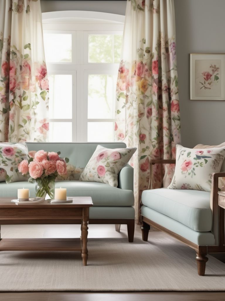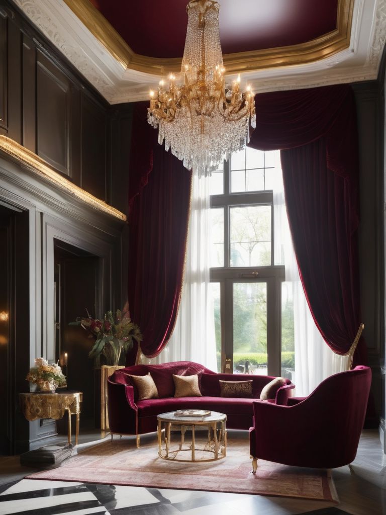 Furniture: Imagine a cozy living room with a plush, oversized sectional sofa in a rich, deep navy velvet. The walls are adorned with intricate, vintage-inspired wallpaper in muted tones of blush pink and sage green, creating a harmonious backdrop. A statement-making coffee table made of reclaimed wood with intricate carvings and brass accents, paired with an elegant chandelier hanging from a high ceiling, completes the sophisticated yet inviting atmosphere.