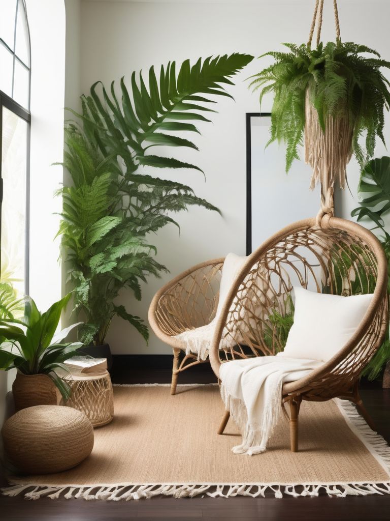 Hanging planters, Potted plants, Wooden shelves, Neutral tone decor, Floral print throw pillows and wall artDescription