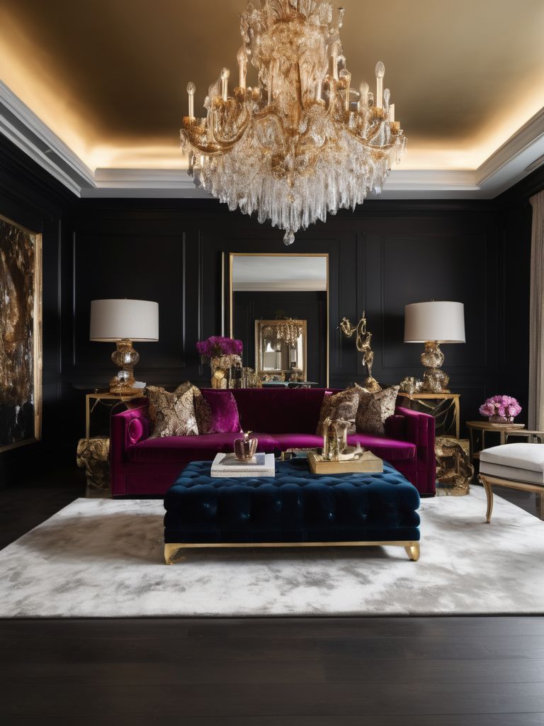Plush velvet furniture, Satin bedding and decor, Gold accent pieces, Floor-length jewel-toned curtains, Statement chandelierDescription