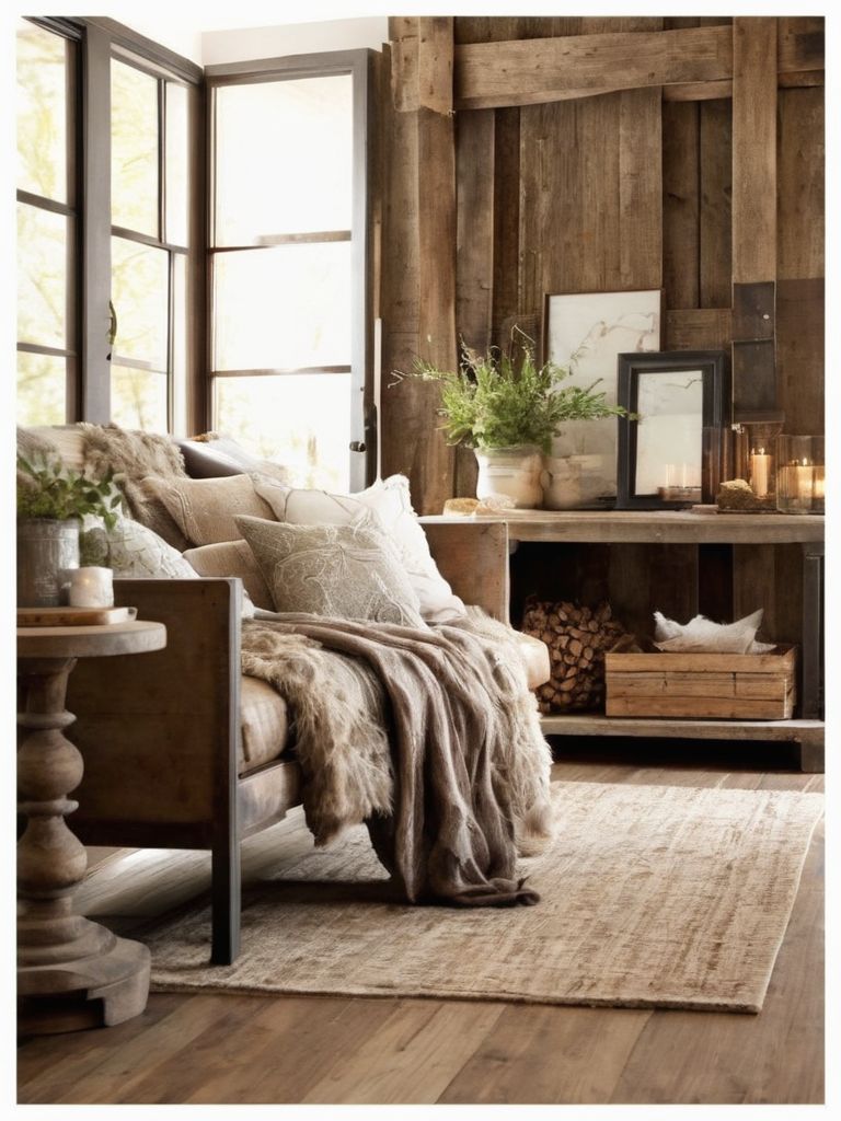 Reclaimed wood furniture, Vintage home decor, Earthy-colored textiles, Cozy throw blankets, Charming accent piecesDescription