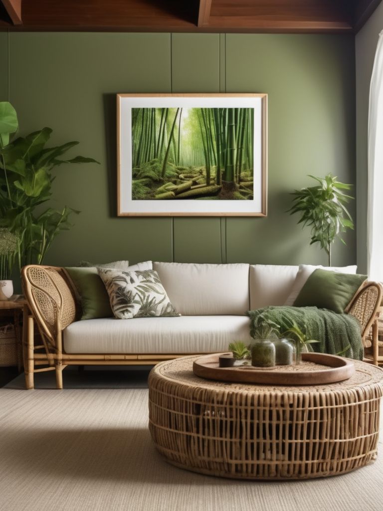 Moss green throw pillows, Bamboo coffee table, Rattan armchair, Botanical print wall art, Leafy indoor plantsDescription