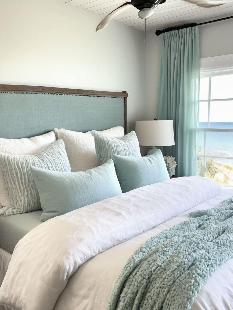 Bedroom Transformation: Create a serene oasis with a coastal theme that incorporates weathered wood furniture, light blue and sea foam green accents, and sheer white curtains. Hang a large, framed beach landscape above the bed and add seashell decorations throughout the room for an extra touch of beachy charm. Complete the look with soft, plush bedding and fluffy floor rugs for a cozy and inviting space.
