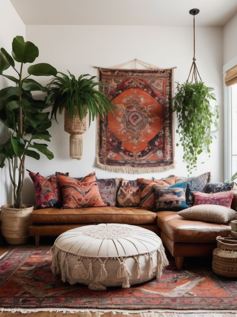 Chic Bohemian Living Room: Transform your living space into a Bohemian oasis with vibrant patterned rugs layered over hardwood floors, complemented by a mix of floor cushions, poufs, and low seating options. Adorn the walls with a stunning gallery of antique mirrors, macramé wall hangings, and framed botanical prints. Finish off the look with cascading greenery, hanging plants, and warm ambient lighting to create a cozy and inviting atmosphere.