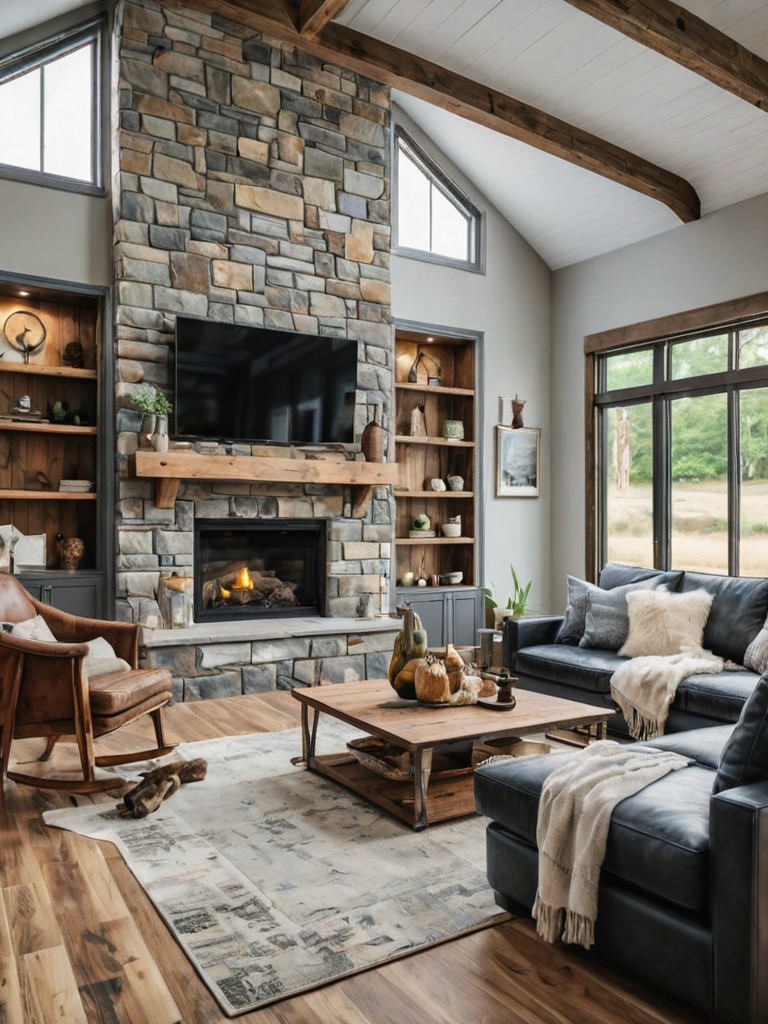 Rustic reclaimed wood accents, Cozy shiplap fireplace, Plush cowhide rug, Sleek black leather furnishings, Earthy color palette of muted greys and soft bluesDescription