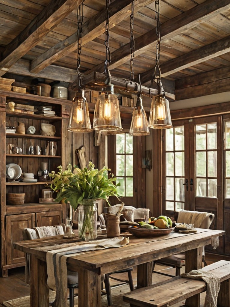 Reclaimed wood furniture, Weathered accents, Soft, earth-toned textiles, Vintage-inspired lighting fixtures, Cozy, rustic décor accessoriesDescription