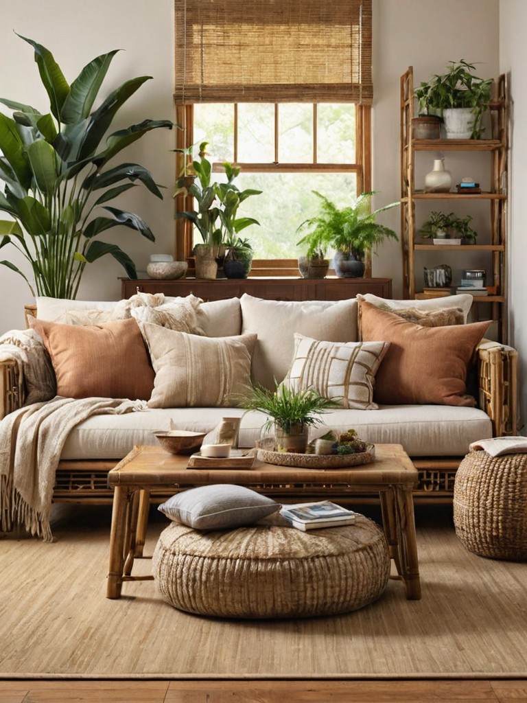 Lively Living Room: Imagine walking into a sunlit sanctuary, adorned with plush, jewel-toned velvet sofas that invite you to sink in and relax. The walls are lined with floor-to-ceiling bookshelves, displaying a curated collection of vibrant artwork and cherished mementos. A rustic, reclaimed wood coffee table serves as the centerpiece, adorned with elegant candles and artfully arranged succulents.