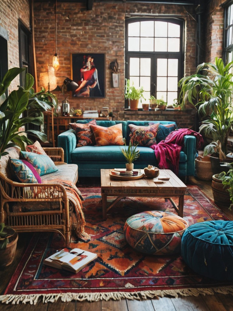 Chic Eclectic Loft: Create a bohemian masterpiece within the confines of your urban loft. Begin with a stunning statement piece, such as a vintage Moroccan rug boasting vibrant colors and intricate patterns. Layer on plush velvet throw pillows in various sizes and jewel tones to achieve a luxurious ambiance, while incorporating rattan furniture and potted plants for a touch of natural charm.