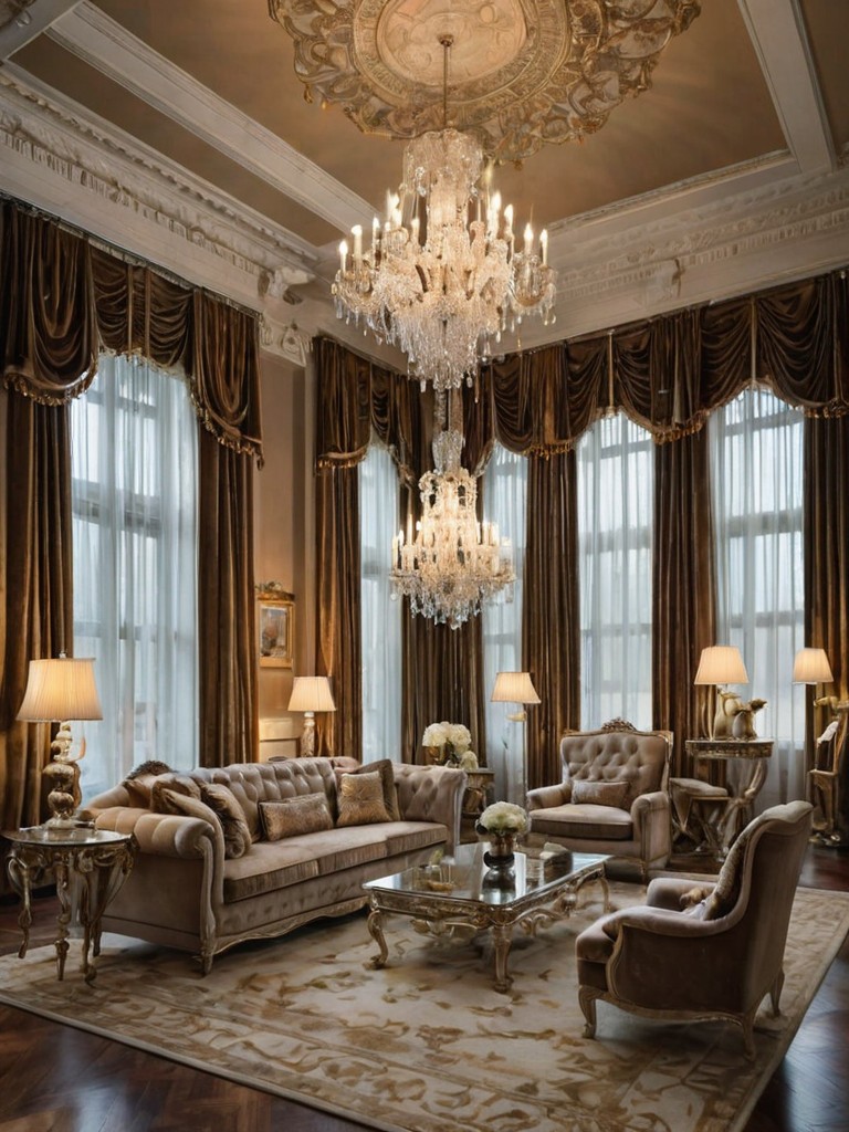 Sparkling Chandeliers and Velvet Drapes: Imagine a lavish home where the centerpiece is an exquisite crystal chandelier hanging from a high ceiling, illuminating the room with a mesmerizing glow. Picture rich velvet drapes cascading down the walls, creating a luxurious and inviting atmosphere. Combined with plush carpets and ornate furniture, this home is a haven of opulence and sophistication.