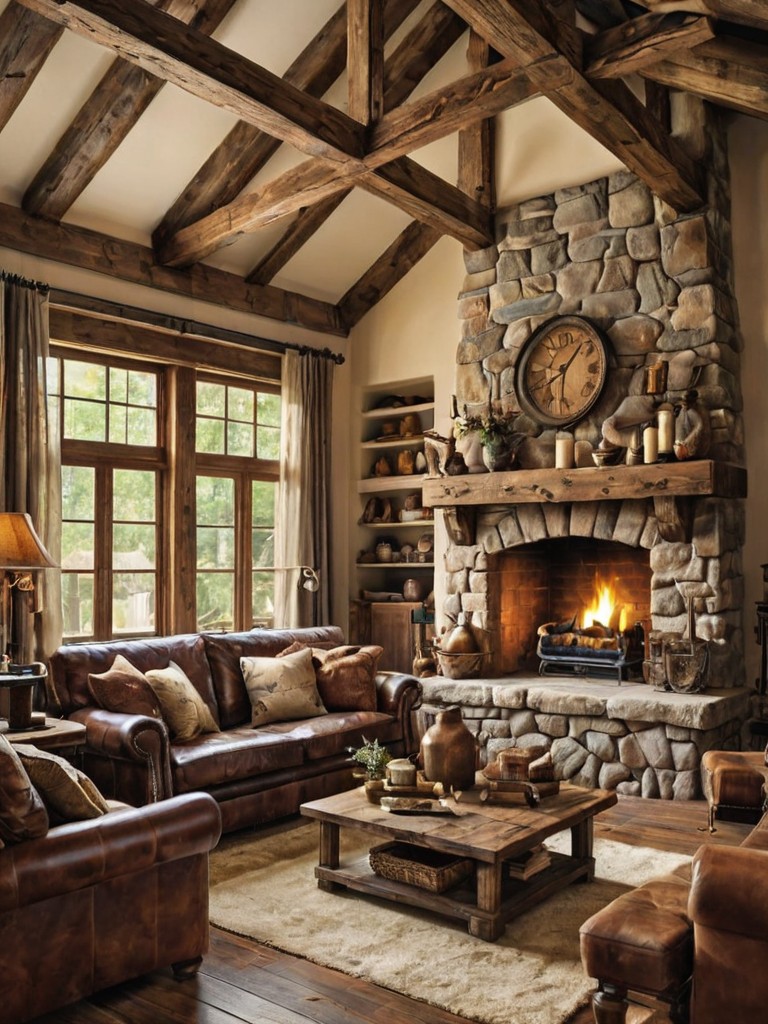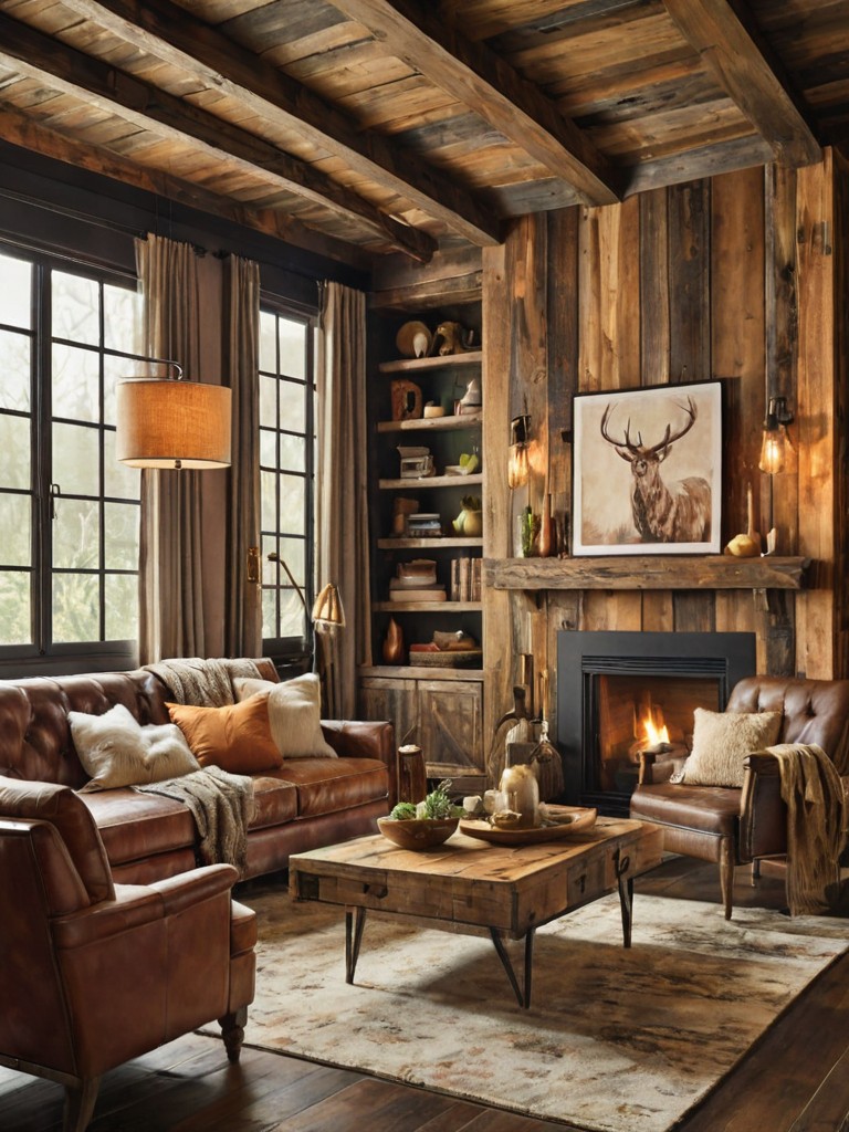 Rustic Cabin Retreat: Create a cozy haven with distressed wooden furniture, plaid patterns, and warm earth tones. Adorn your walls with vintage maps and framed nature photography. Complete the look with soft, furry throws and pillows, and a crackling fireplace to bring the essence of a rustic cabin getaway into your home.