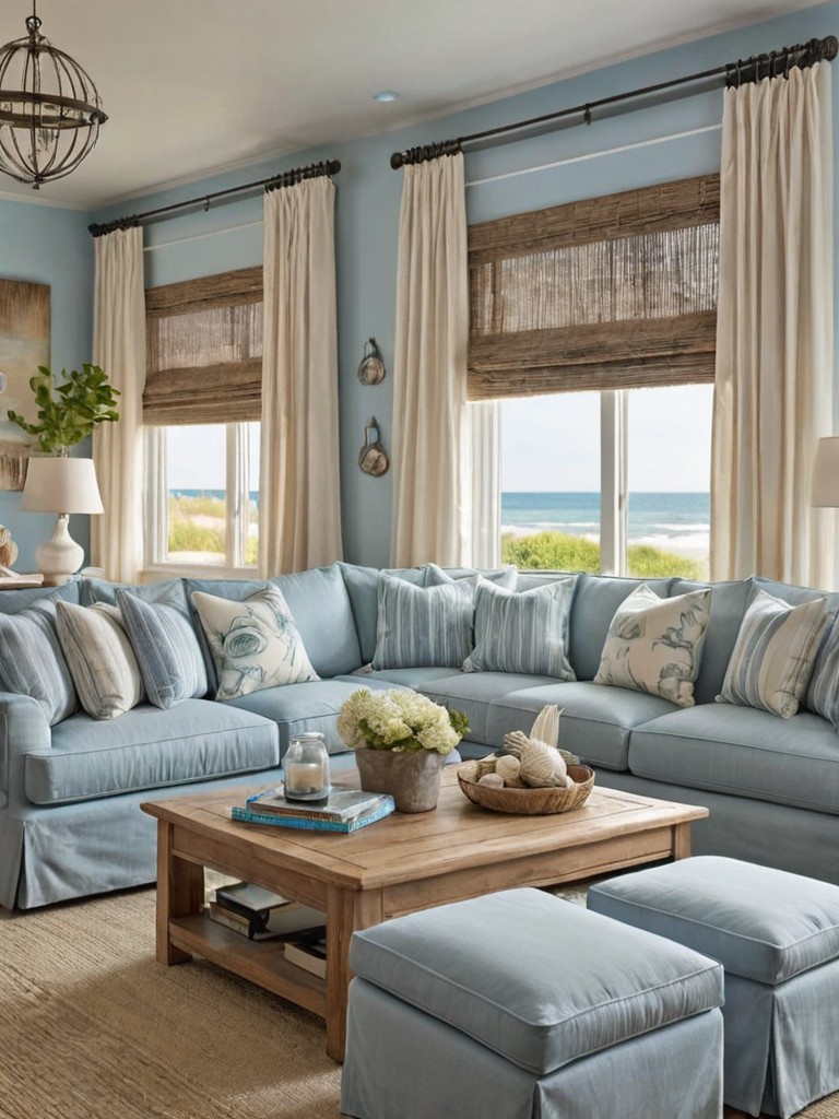 White curtains, Seashell-shaped mirrors, Soft blue accents, Sandy-hued furniture, Coastal artworkDescription