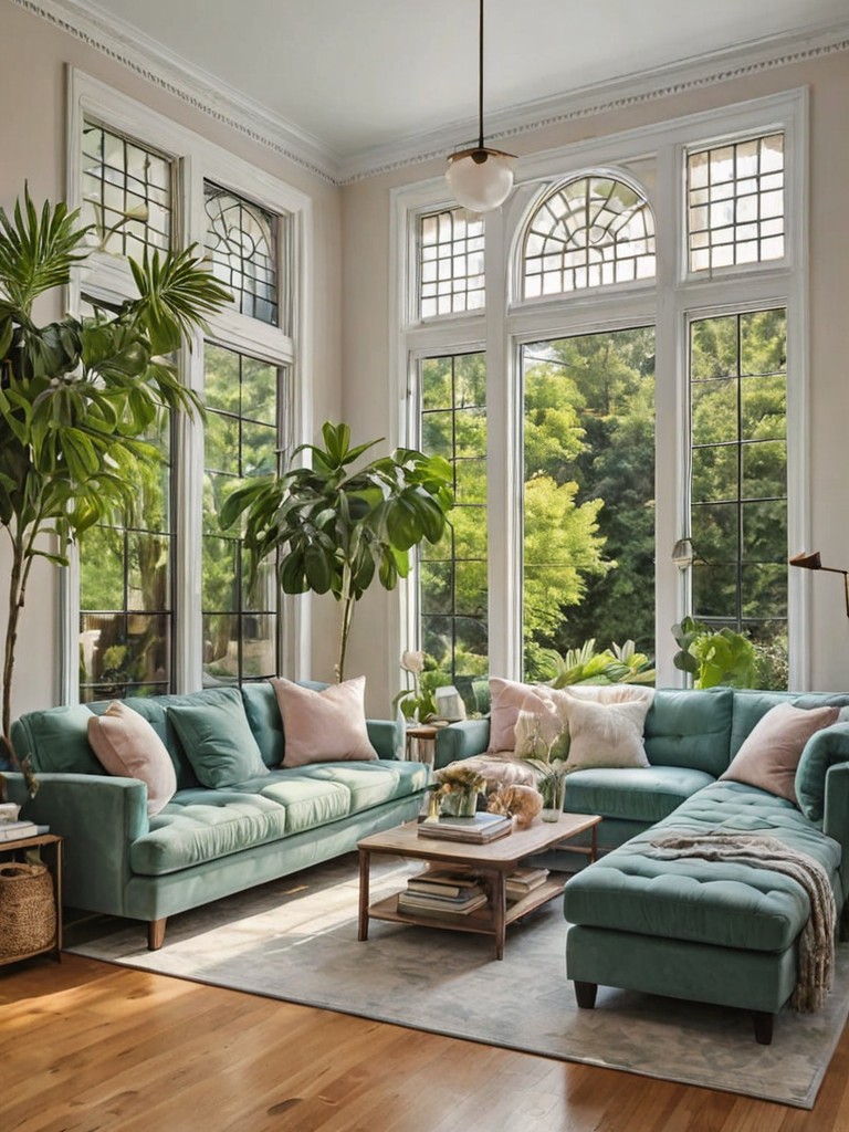 Seafoam green paint, Nautical artwork, White sectional sofa, Decorative throw pillows, Driftwood-inspired coffee tableDescription
