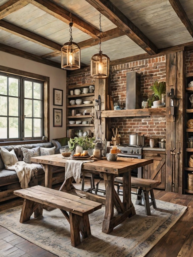 Reclaimed wood feature wall, Vintage mason jars, Textured throws, Copper accents, Statement chandelierDescription