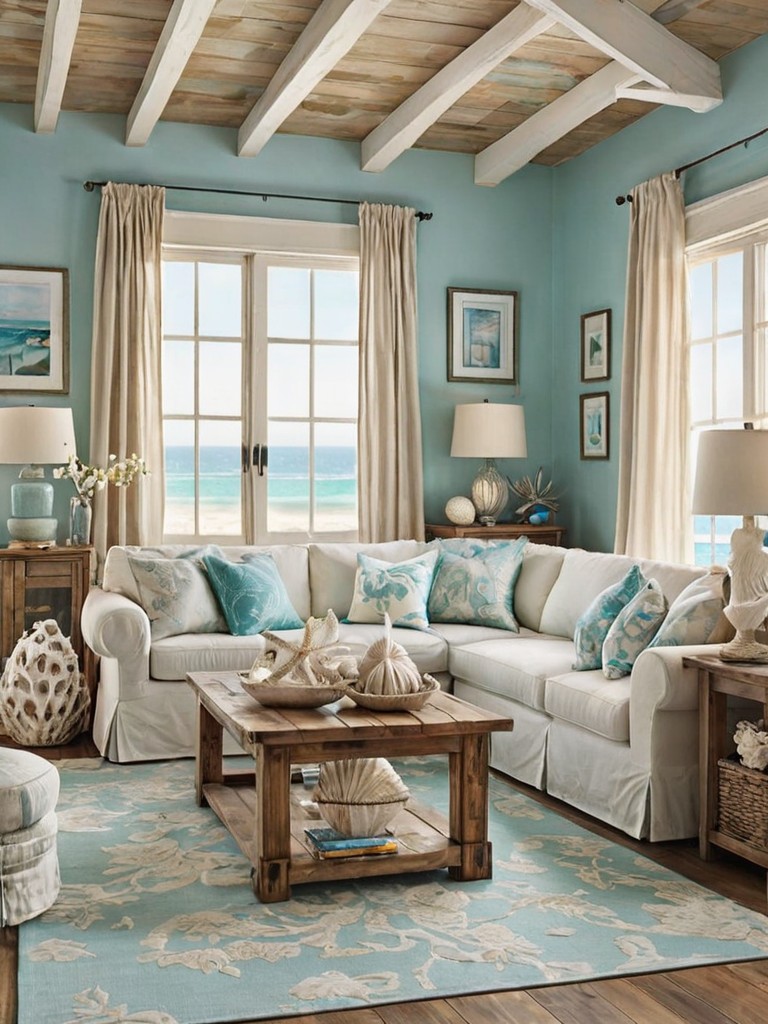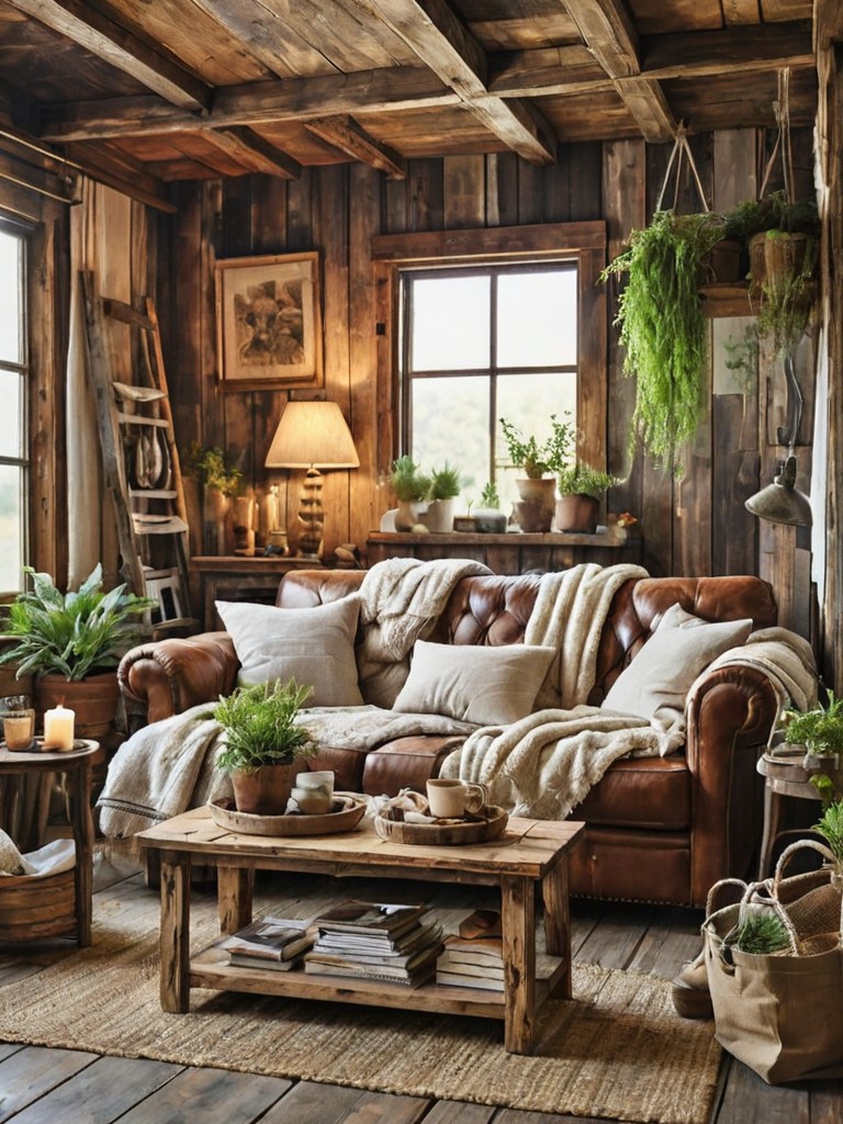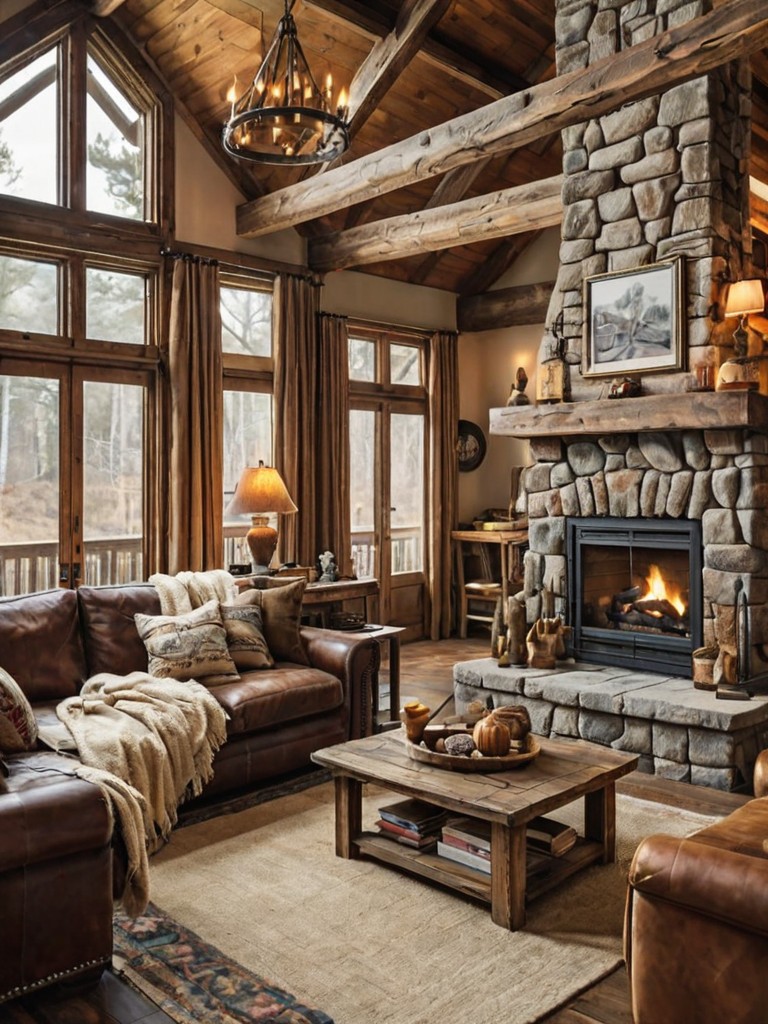 Plush, oversized sectional sofa, Rustic wooden coffee table, Soft, shaggy area rug, Decorative pillows and throws, Nature-inspired artworkDescription