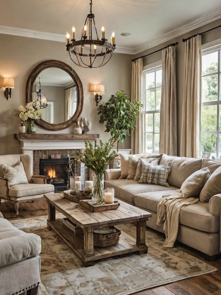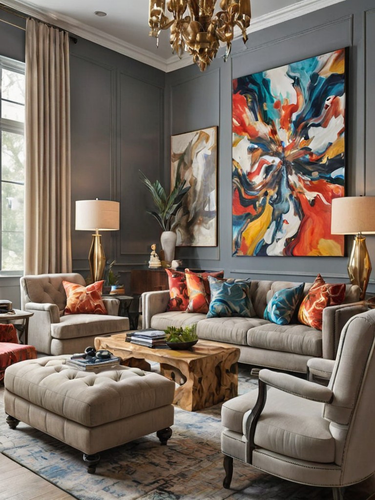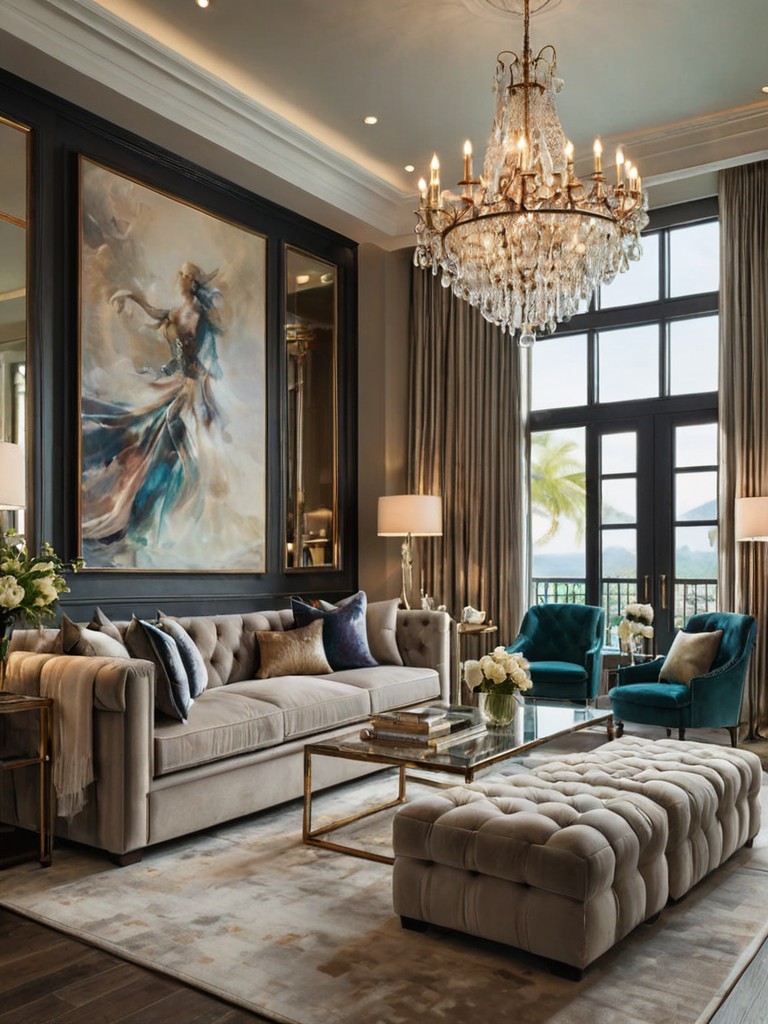 Console table, Statement mirror, Accent chairs, Vibrant rugDescription