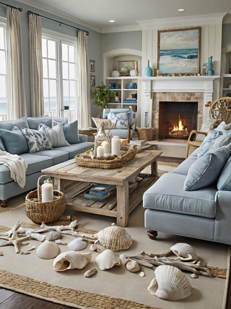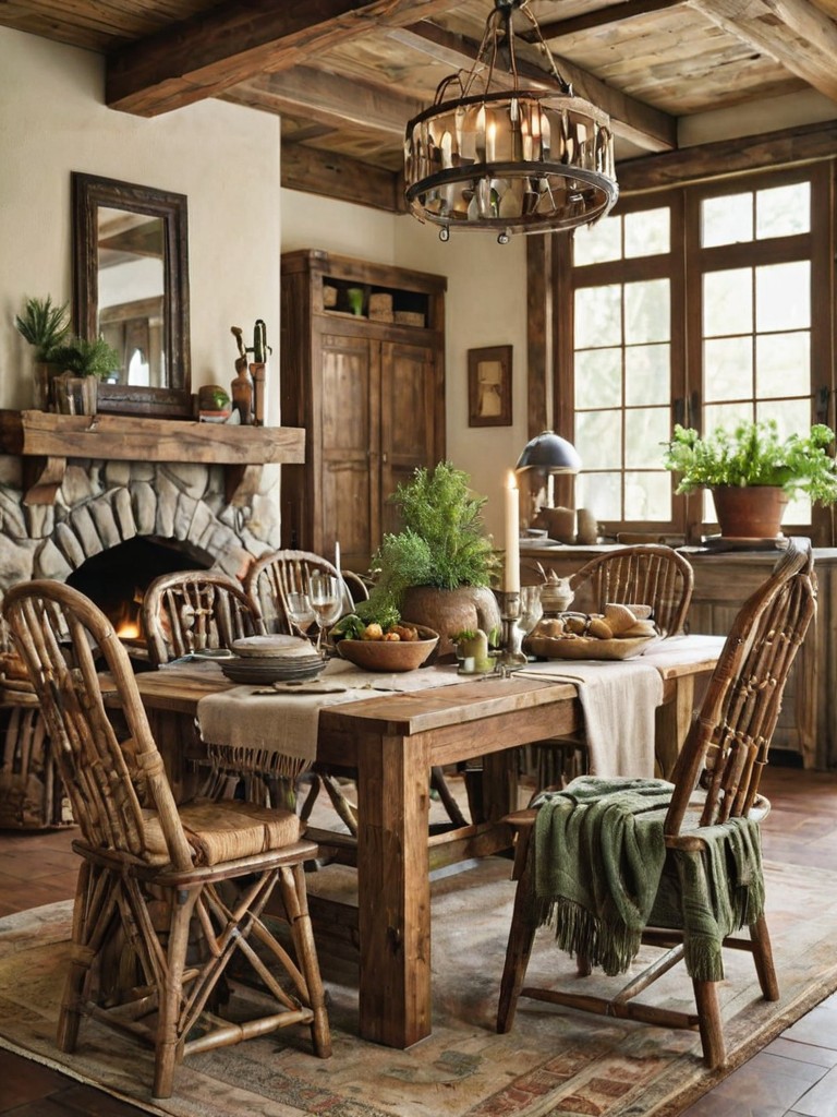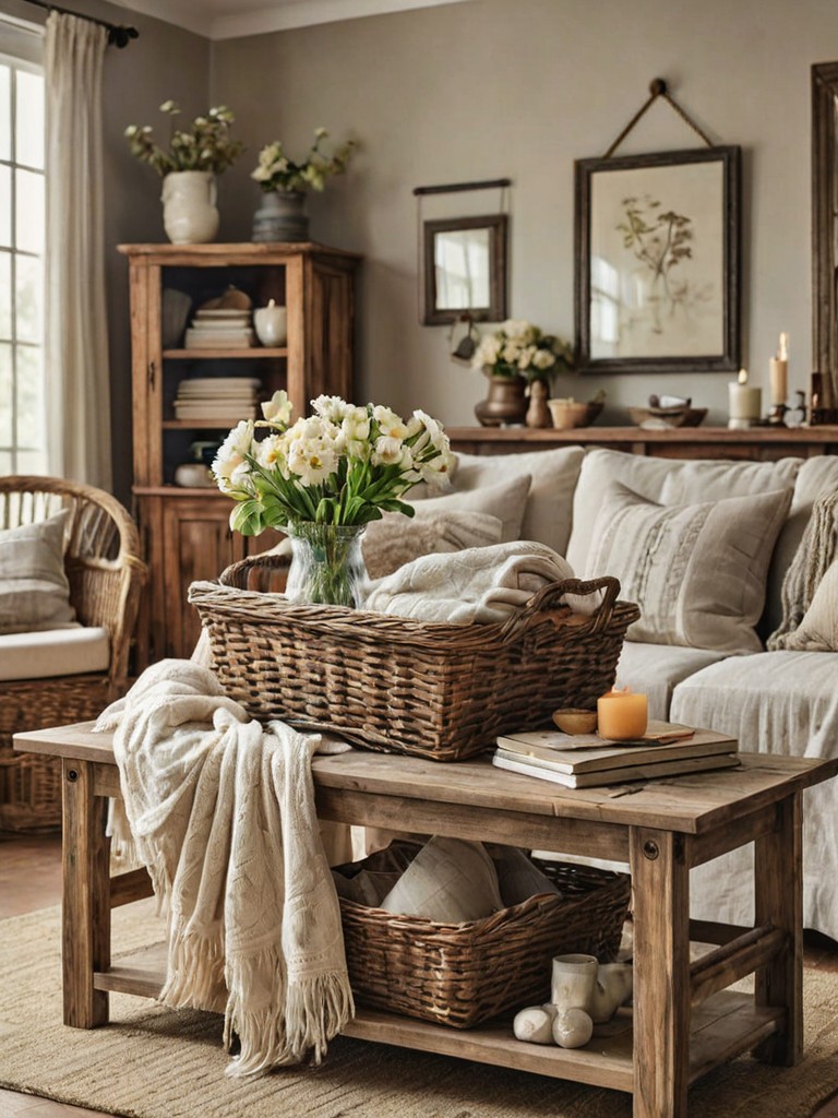 Distressed wooden furniture, Vintage accessories, Soft neutral-colored decor, Cozy blankets, Woven basketsDescription