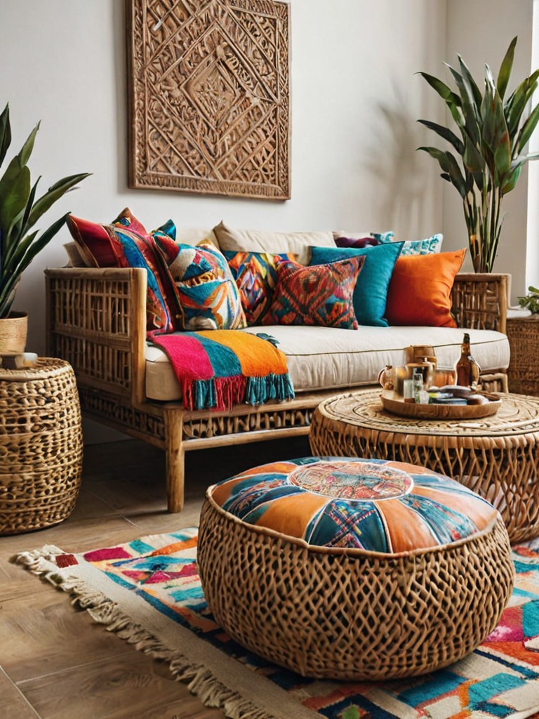 Handmade Moroccan-inspired throw pillows, Woven rattan coffee table, Distressed leather armchair, Vibrant colored rugs, Geometric patterned wall artDescription