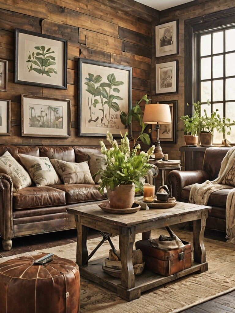 Reclaimed wood paneling, Vintage-inspired signage, Framed botanical prints, Distressed leather furniture, Wrought iron and distressed metal accentsDescription