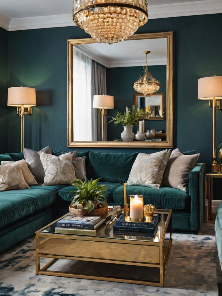 Apartment Transformation: Imagine walking into a stylishly modern living room, adorned with plush velvet couches in shades of deep emerald and midnight blue. The walls are painted a calming dove grey, contrasting beautifully with the touch of gold on the picture frames and candle holders. Soft, ambient lighting from strategically placed floor and table lamps creates a cozy atmosphere, inviting you to unwind and relax in this sophisticated oasis.