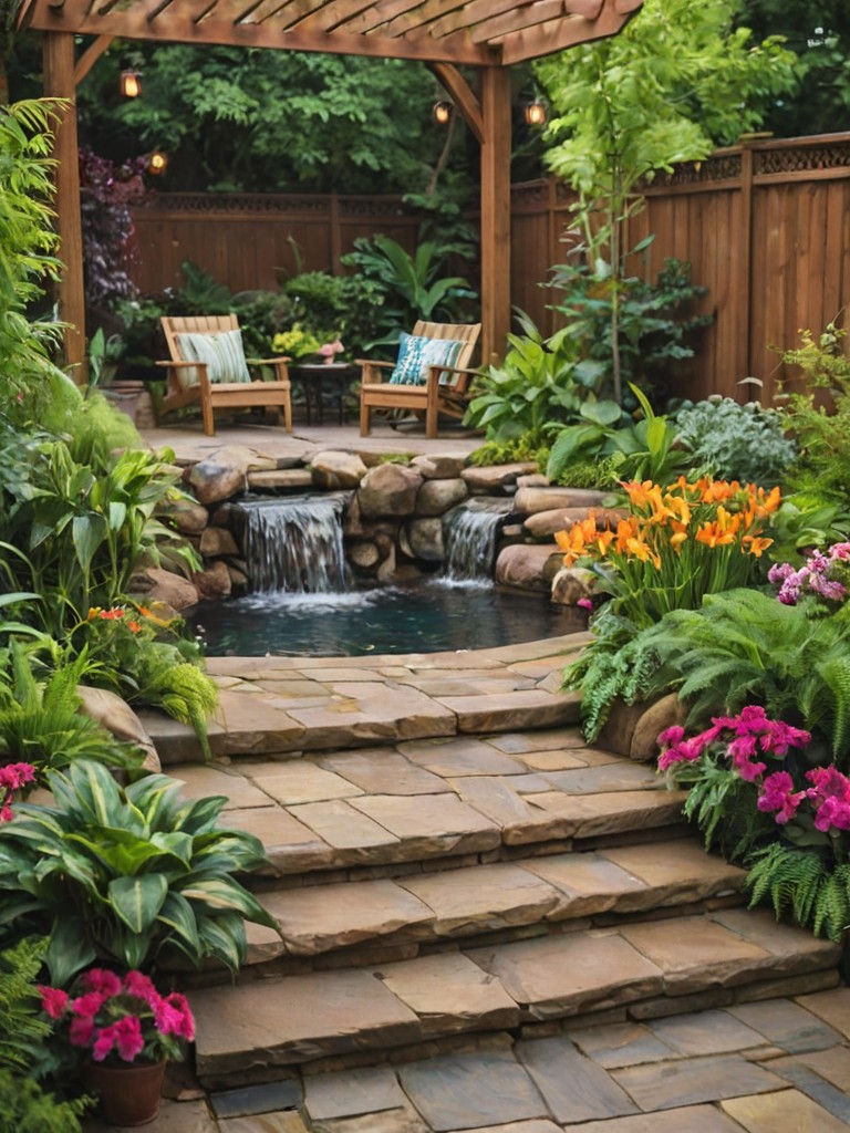 Water features, Cozy seating areas, Path lights, Aromatic plants, Lush greeneryDescription
