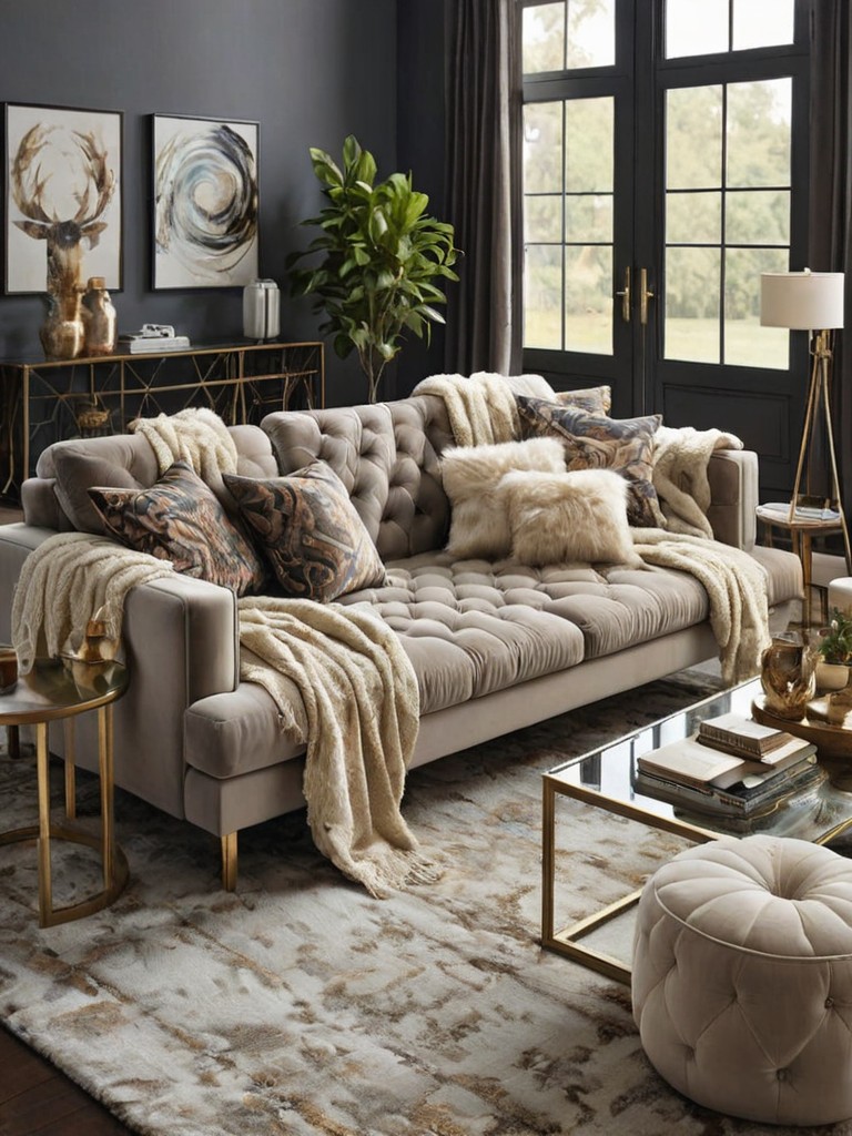 Velvet sofa, Throw pillows, Faux fur rug, Coffee table, Glass or metal accentsDescription