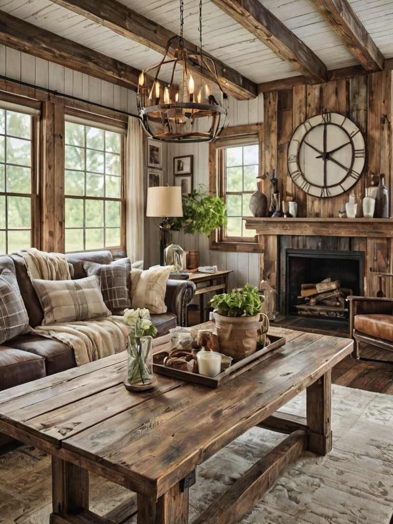 Reimagine your living space with a rustic farmhouse theme. Transform your walls with a distressed wood wallpaper, creating a cozy and inviting atmosphere. Complete the look with vintage furniture pieces, such as a reclaimed barn door coffee table and a weathered wood dining table, for a charming and nostalgic feel.