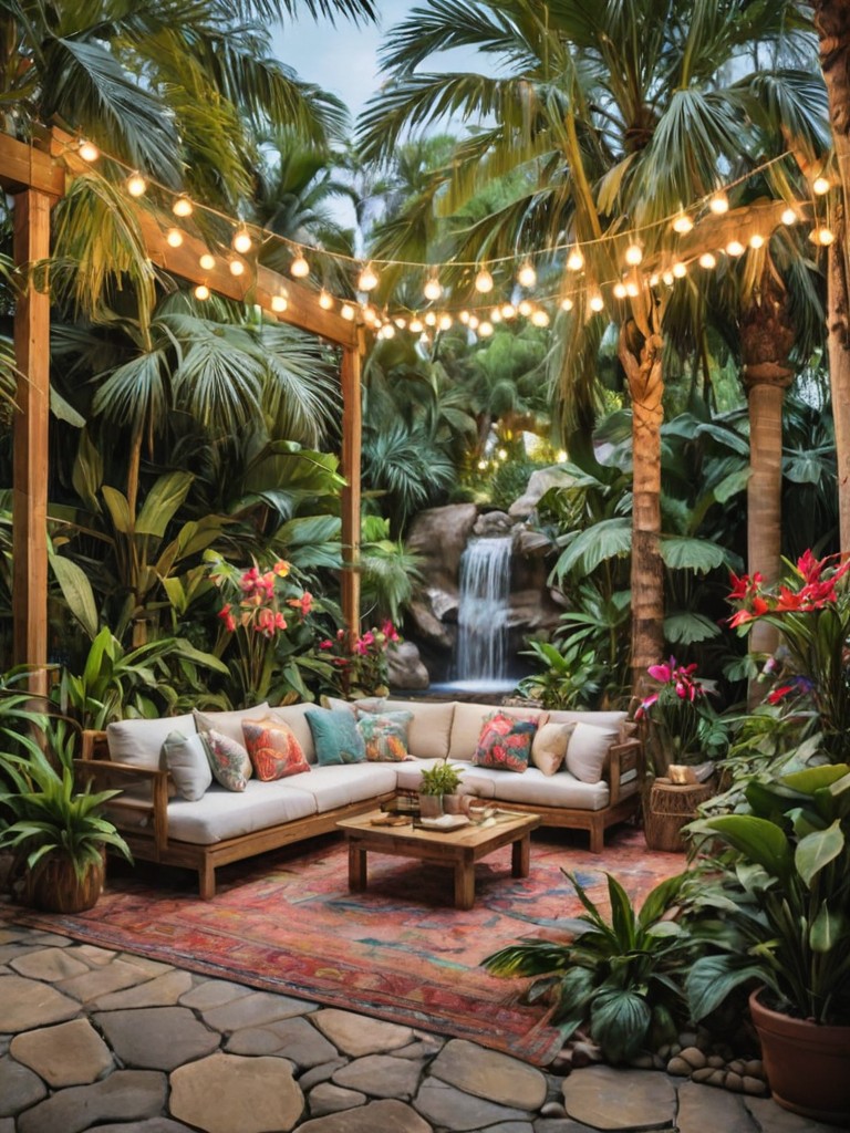Patterned throw pillows, Hand-woven rug, Macrame plant hangers, Lush greenery, Earthy-toned home decorDescription