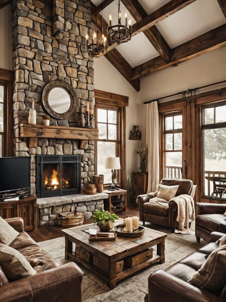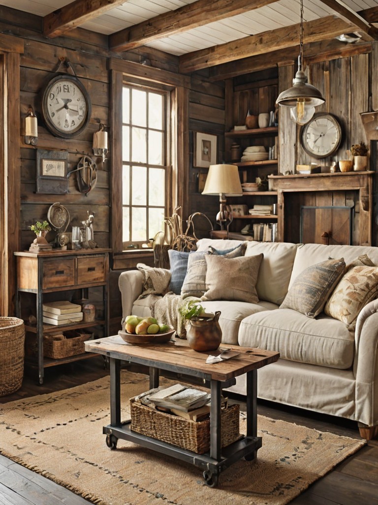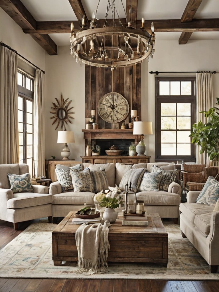 Distressed wood paneling, Reclaimed barnwood furniture, Flowing linen curtains, Muted green and blue throw pillows, Earthy-toned accentsDescription