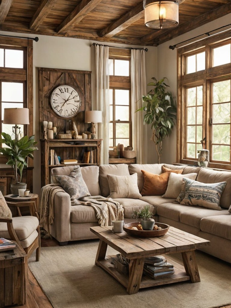 Camel-colored sectional couch, Decorative toss pillows, Knitted blankets, Reclaimed wood coffee table, Vintage-inspired wall artDescription