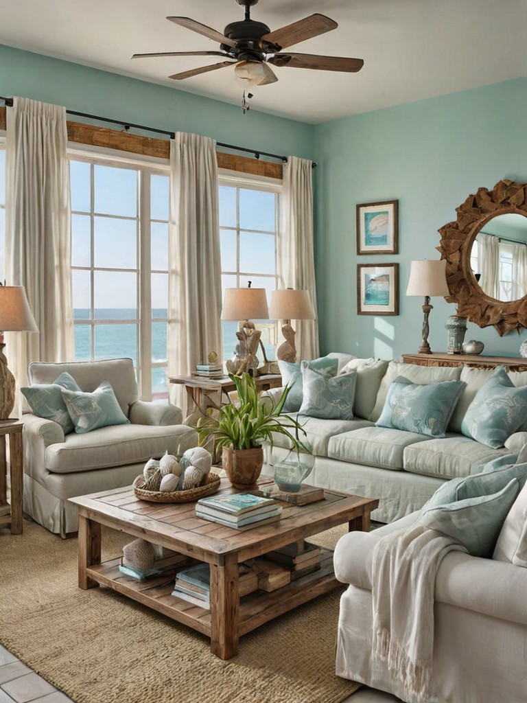 Dreamy Coastal Oasis: Create a serene and relaxing atmosphere in your home with this home decorating idea. Use soft, pastel colors like seafoam green and light blue for the walls, and incorporate natural elements like seashells and driftwood as accents. Complete the look with plush, oversized furniture and sheer curtains to let in the gentle ocean breeze.