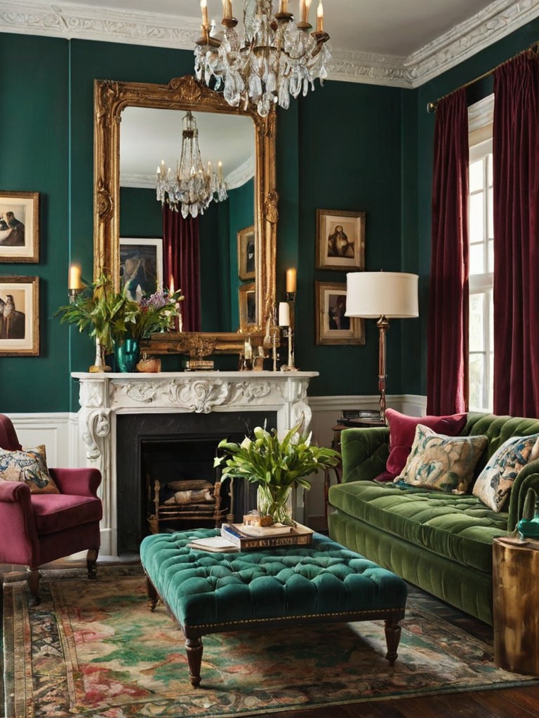 Vintage-Inspired Living Room: Create a cozy and inviting space with carefully selected antique furniture pieces, such as a tufted velvet sofa in a rich emerald green, paired with a distressed wooden coffee table and a vintage-inspired area rug. Add a touch of elegance with wall sconces providing soft lighting and framed botanical prints hung above a large ornate mirror. Complete the look with plush velvet curtains in a deep burgundy shade, offering both privacy and a touch of old-world charm.