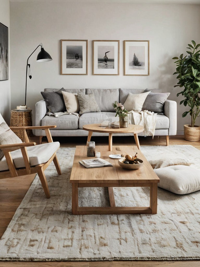Neutral-colored throw pillows, Wooden coffee table, Pastel-colored rug, Linen curtains, Scandinavian-style armchairDescription