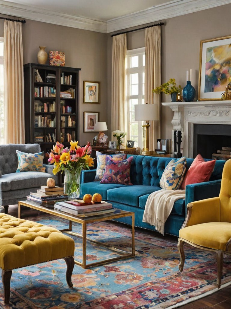 Furniture: Create an inviting and cozy living room space by incorporating a mix of plush sofas and armchairs, adorned with soft velvet cushions in vibrant jewel tones. Style the room with an elegant coffee table featuring a glass top and gold accents, surrounded by a collection of artfully arranged books and a decorative vase filled with fresh flowers. Complete the look with a statement rug that adds depth and warmth to the room, while also tying in the color scheme of the furniture.