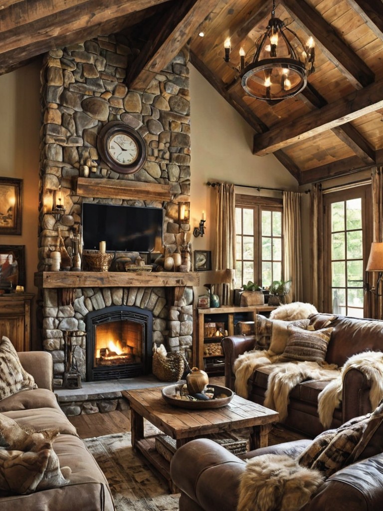 Living Room Transformation: Create a cozy, rustic retreat in your living room with this home decorating idea. Incorporate natural elements such as distressed wood furniture, woven baskets, and plush faux fur throws. Enhance the ambiance with warm lighting from vintage-inspired pendant lights and a flickering fireplace, completing the homey atmosphere.
