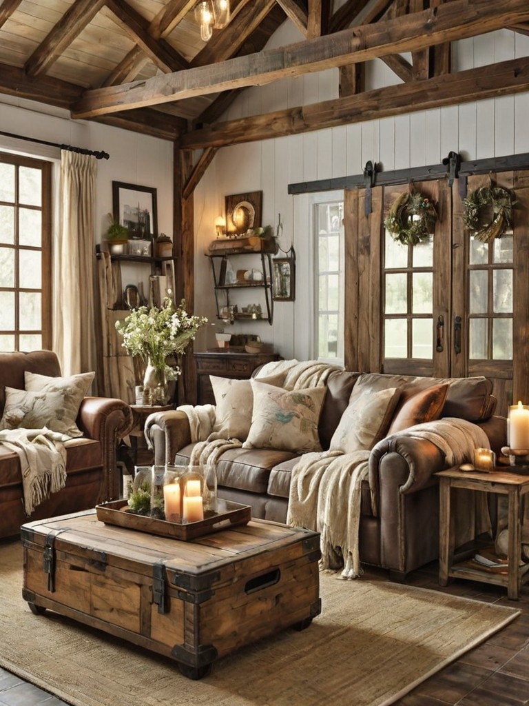 Rustic Farmhouse Chic: Imagine transforming your living room into a cozy retreat reminiscent of a charming farmhouse in the countryside. Rich wooden beams overhead, adorned with delicate fairy lights, create a warm and inviting atmosphere. Vintage pieces, such as distressed barn doors and well-worn leather armchairs, add a touch of nostalgia, while plush, oversized throw pillows in faded floral prints bring comfort and sophistication.